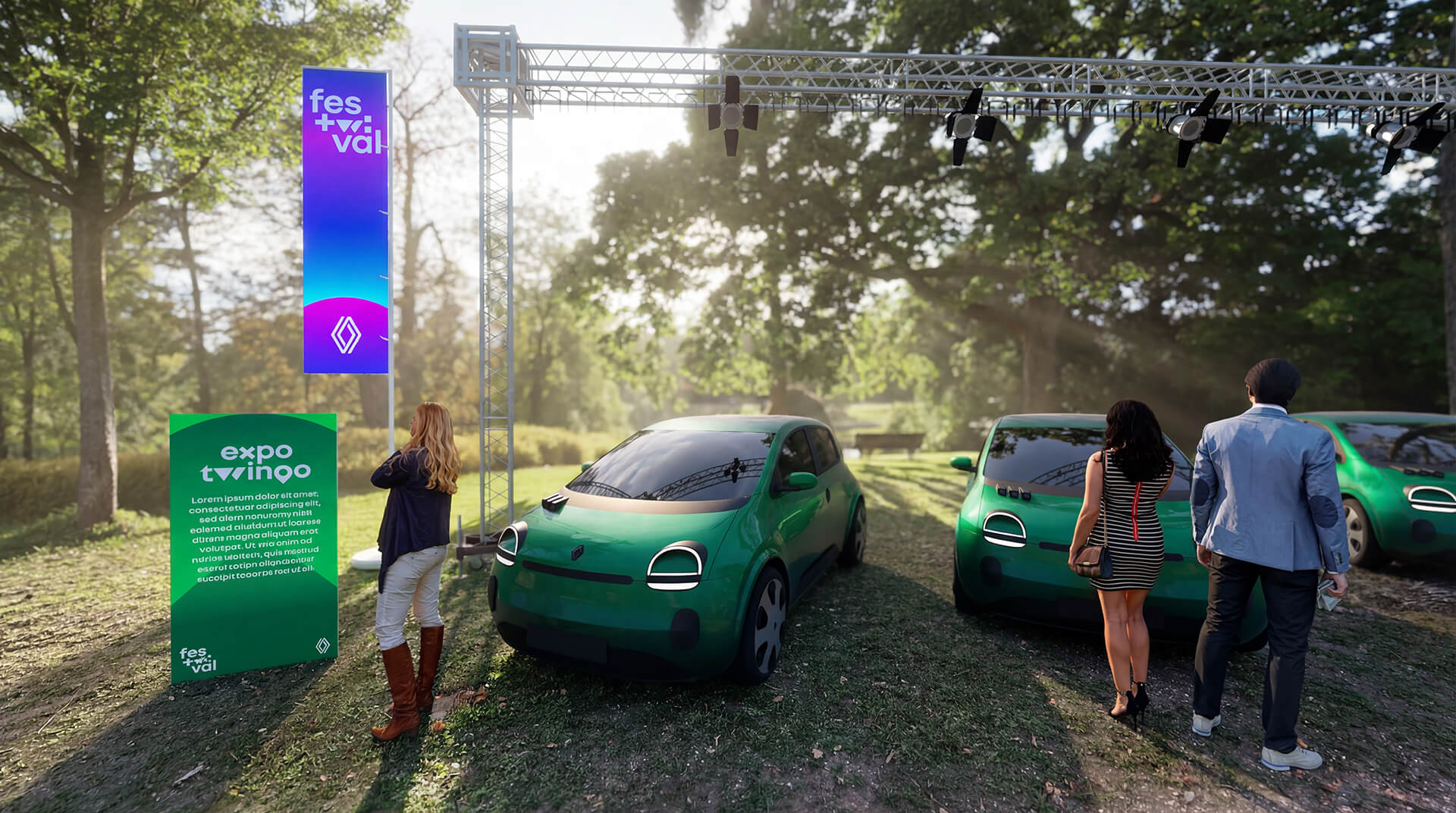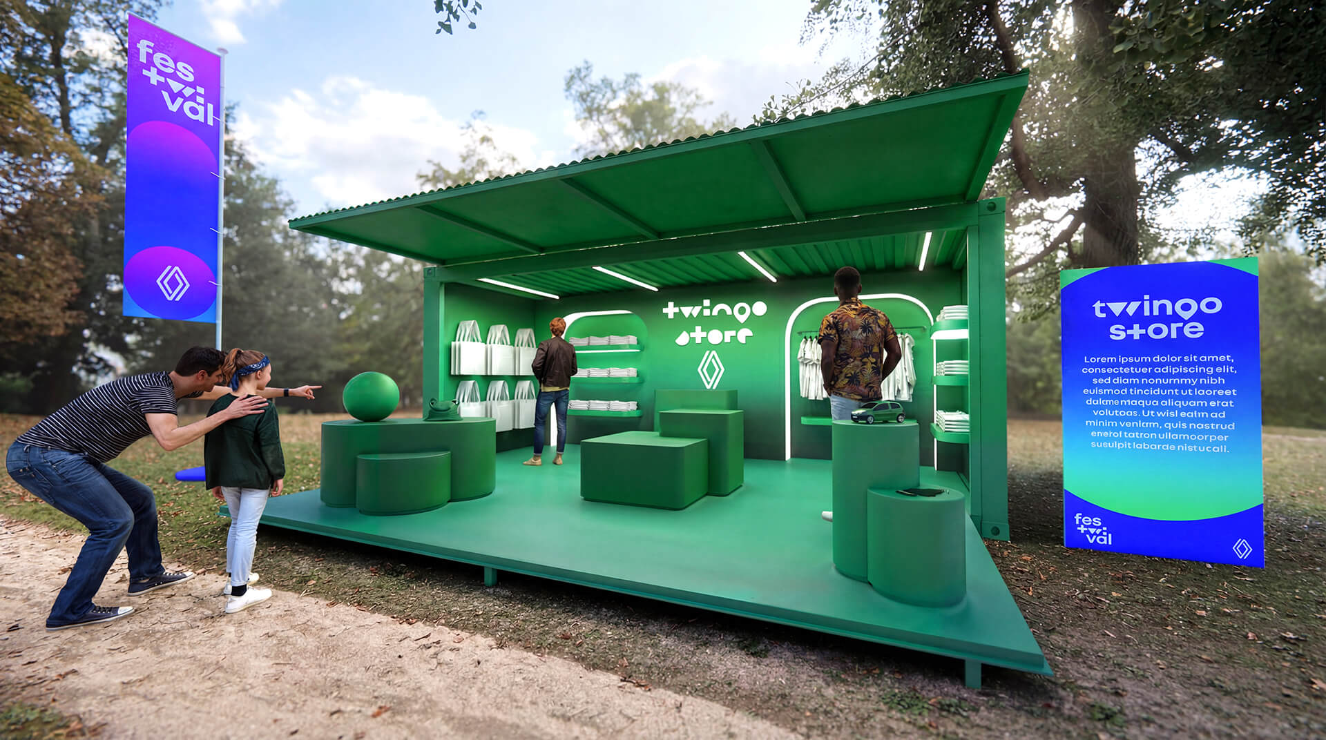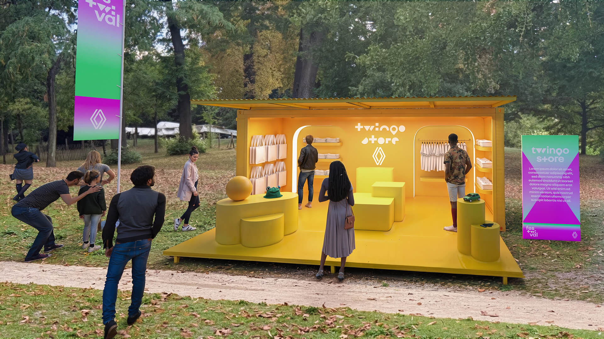 Proposition scénographique du "FESTWIVAL" dans le cadre de l’appel d’offre Renault à l'occasion du retour de la Twingo electrique en 2026. Réalisée pour le compte de l’agence Hopscotch.