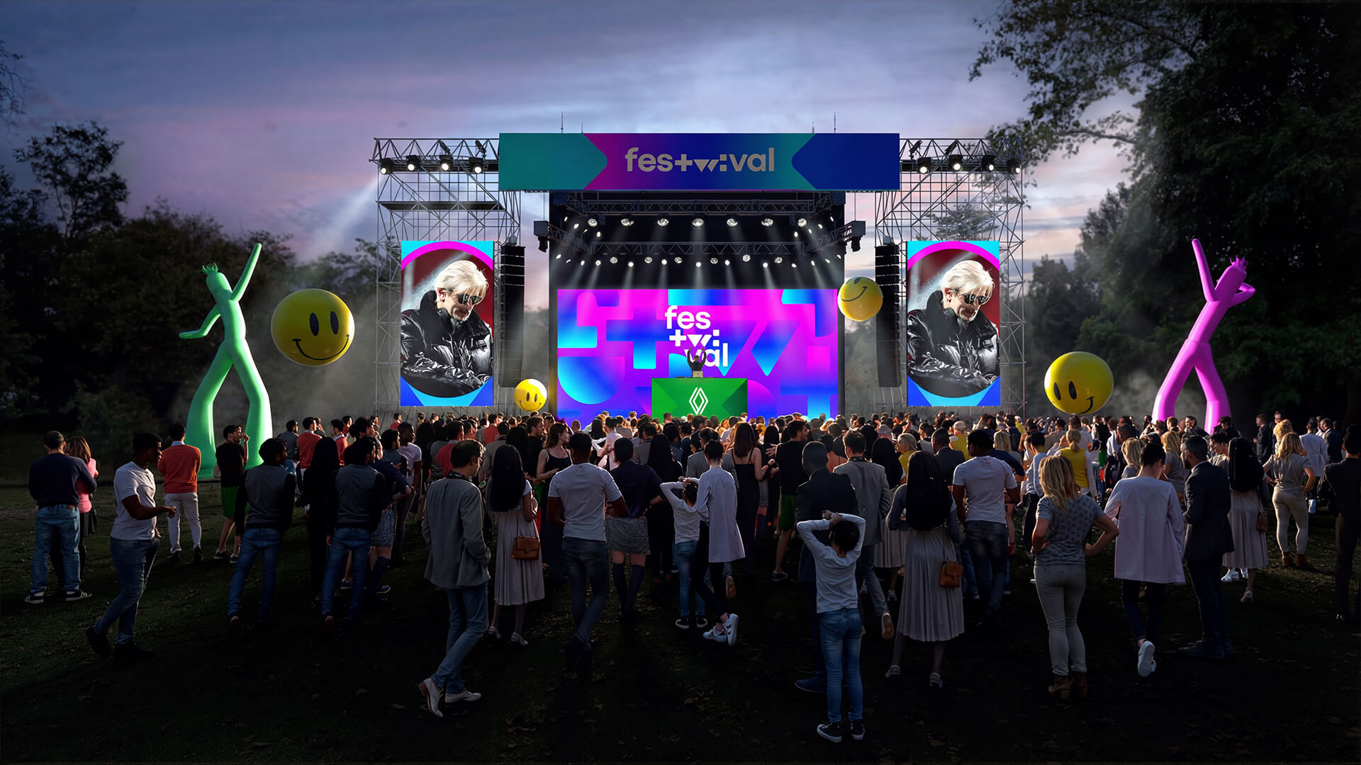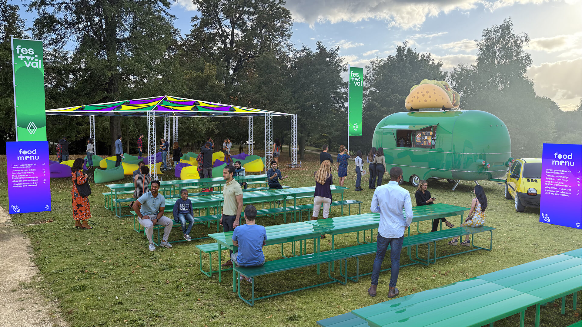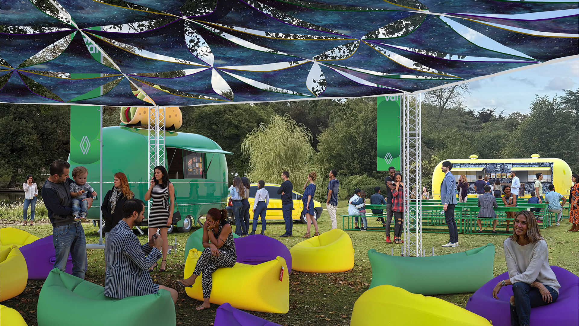 Proposition scénographique du "FESTWIVAL" dans le cadre de l’appel d’offre Renault à l'occasion du retour de la Twingo electrique en 2026. Réalisée pour le compte de l’agence Hopscotch.